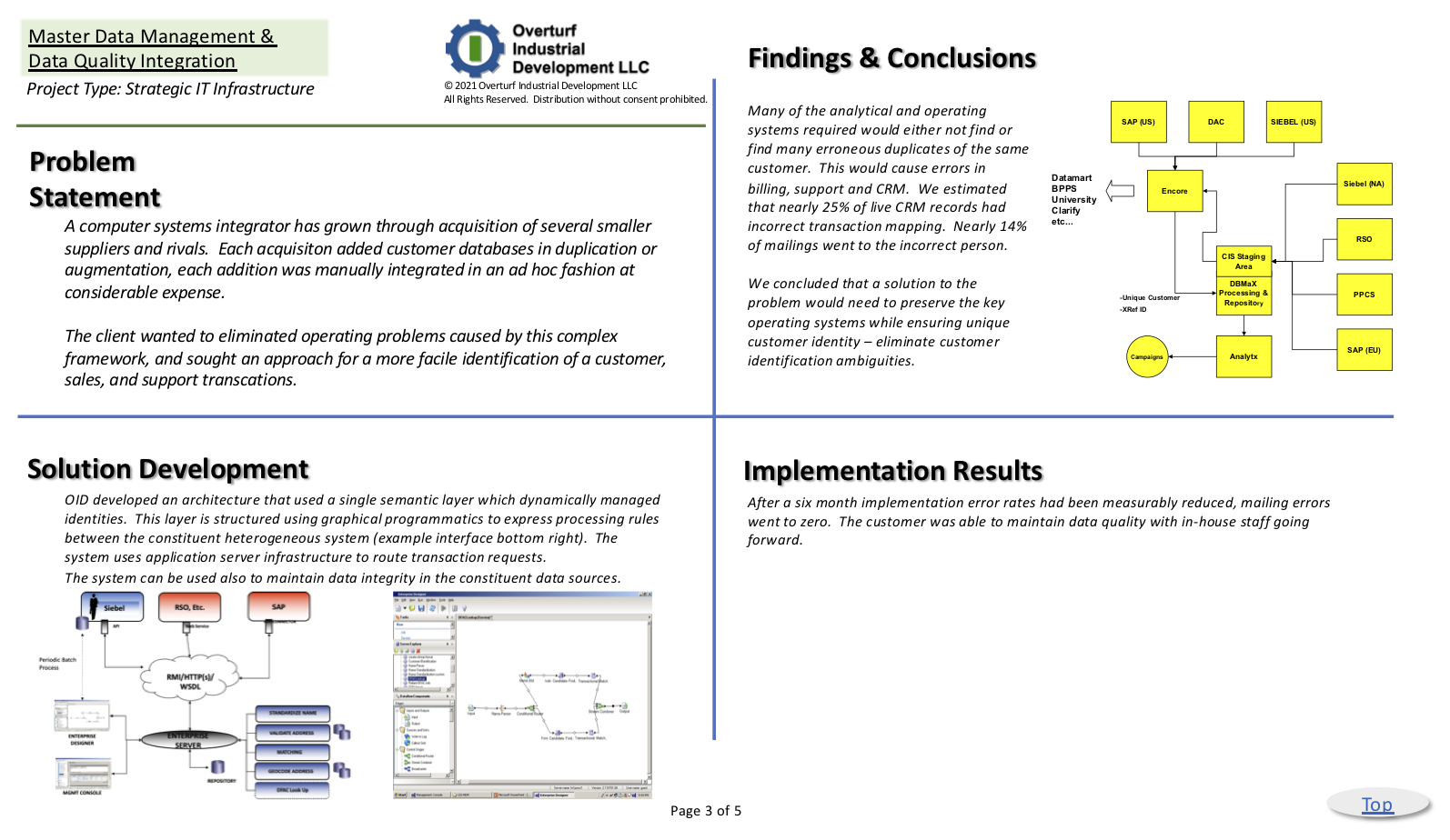 A computer systems integrator has grown through acquisition of several smaller suppliers and rivals. Each acquisition added customer databases in duplication or augmentation, each addition was manually integrated in an ad hoc fashion at considerable expense.